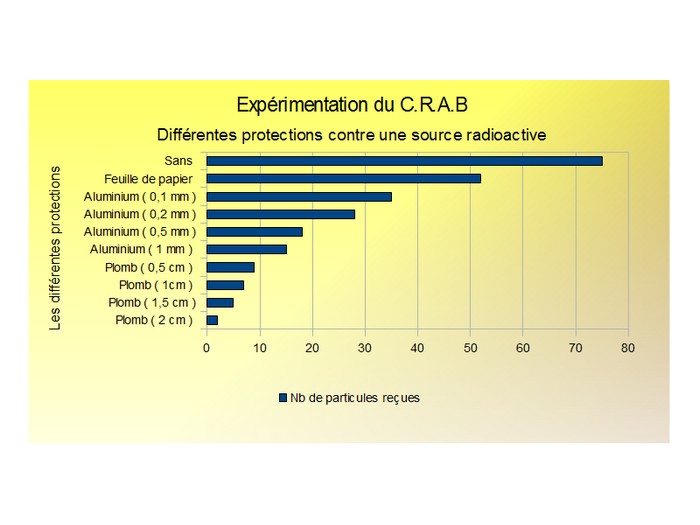 On observe une baisse significative des particules reçues par le compteur plus les protections sont épaisses. Le plomb reste le plus efficace, il est nottament utilisé en imagerie médicale sous forme de tablier pour limiter l'impact des rayons X sur le personnel manipulant.